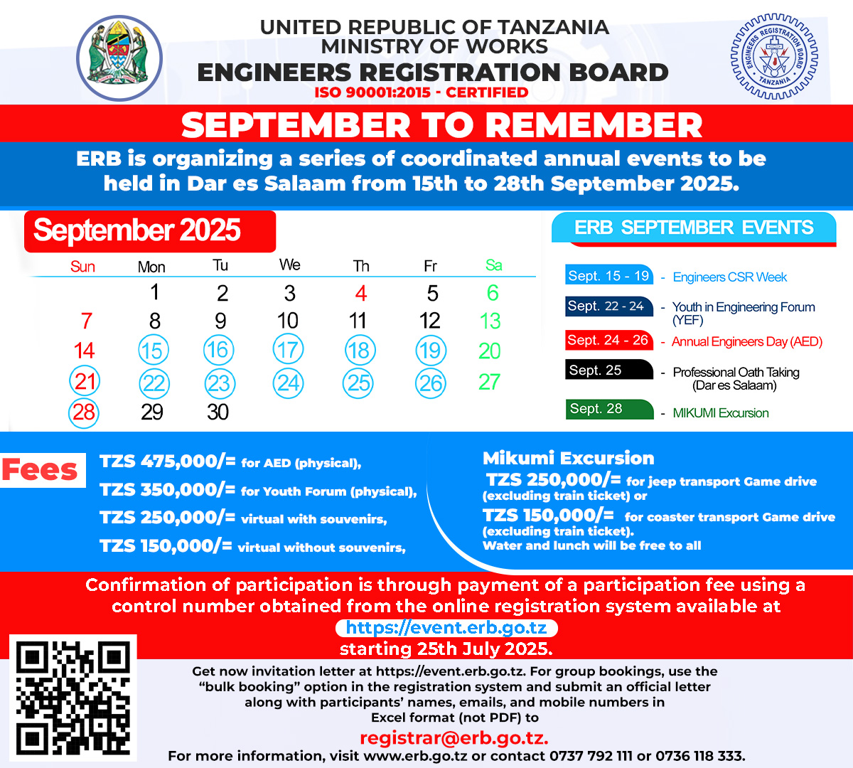 The Board is organizing three events YEF, AED and MARATHON scheduled in September 2025. These events are aligned with ERB‘s mandate to foster professional development among engineering practitioners. They are also part of ERB contemporary priorities, which are attaining gender equality in the profession by 2030, Youth acceleration and Supporting STEM teaching and learning in Secondary Schools. STEM is a foundation for tertiary engineering training.